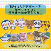 ●動物さんも、みんな集まってデザートを食べようとしたとき、我慢しきれなくなった誰かが食べちゃった!動物さんの口元や手元を見て、誰が食べたのか、みつけよう!
