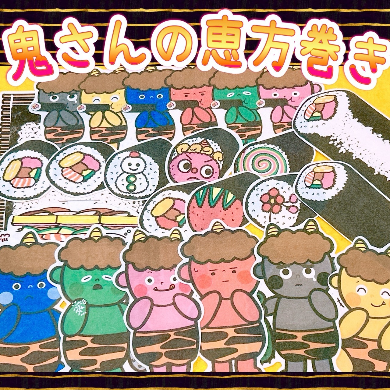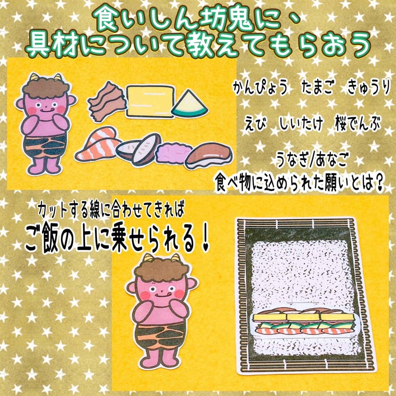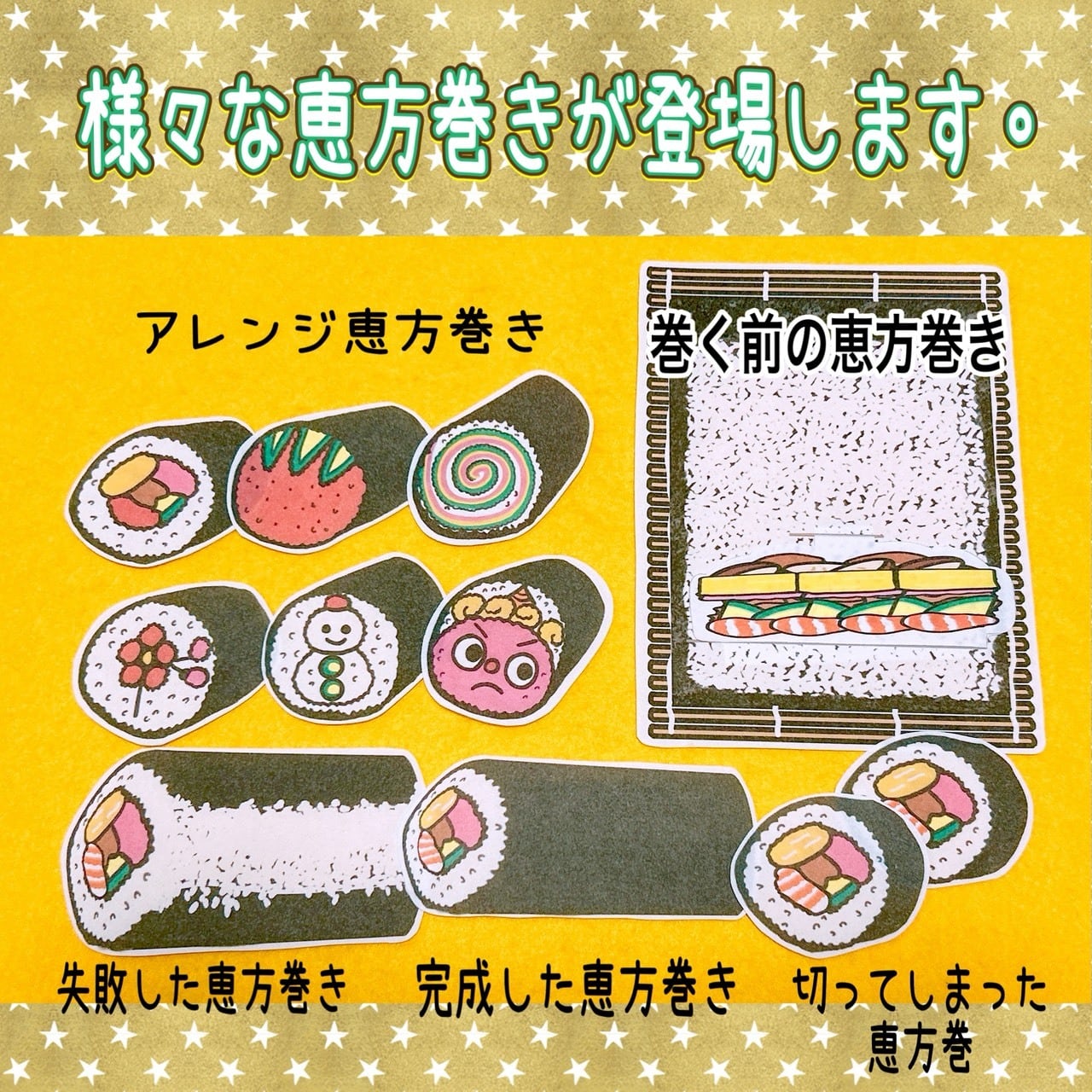恵方巻 7種の具材 豆 鬼は外 福は内 意味 おに 節分の意味 保育教材 保育 パネルシアター 絵本 紙芝居 手遊び お話 年少年中年長 2歳児 3歳児 4歳児 5歳児