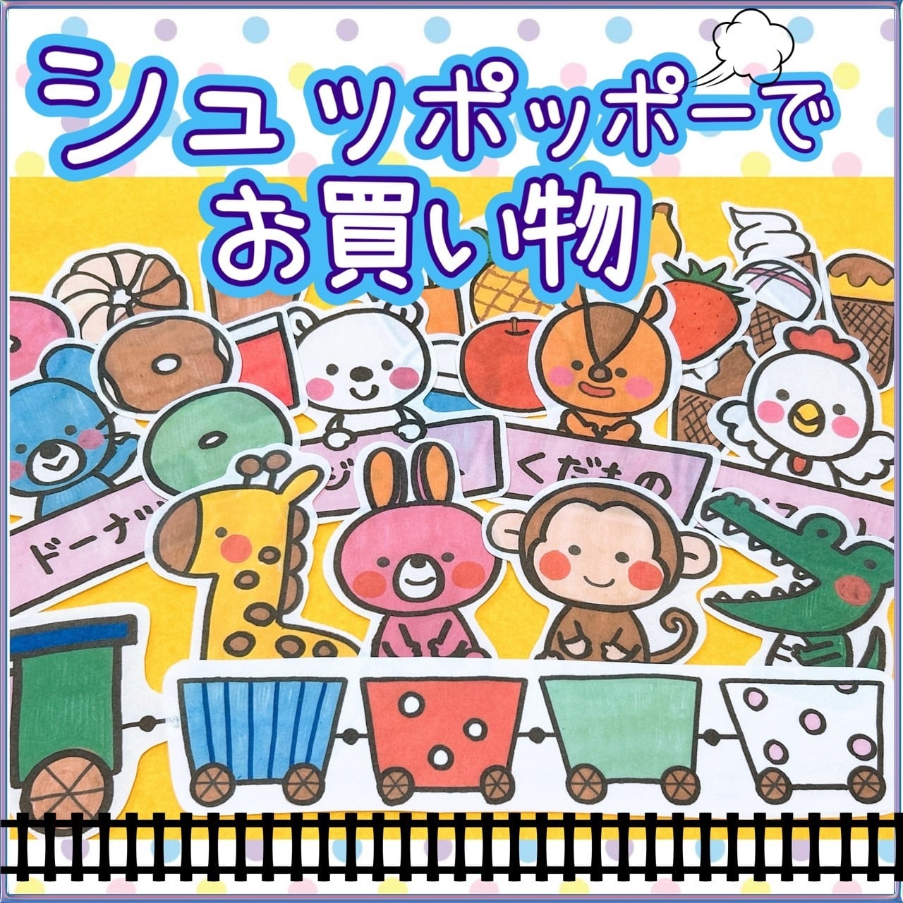 シュッポッポーでお買い物 シュポポ 電車 汽車 動物 お店屋さん ごっこ遊び 導入 2歳児 3歳児 4歳児 5歳児 パネルシアター 乗り物ごっこ おみせやさん のりもの 保育 春 夏 秋 冬 子ども 誕生日 バースデー